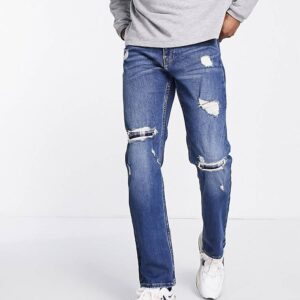 The Couture Club straight leg denim jeans in midwash blue with ripped knee detail