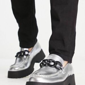 ASOS DESIGN chunky sole loafers with oversized chain in silver faux leather with contrast sole