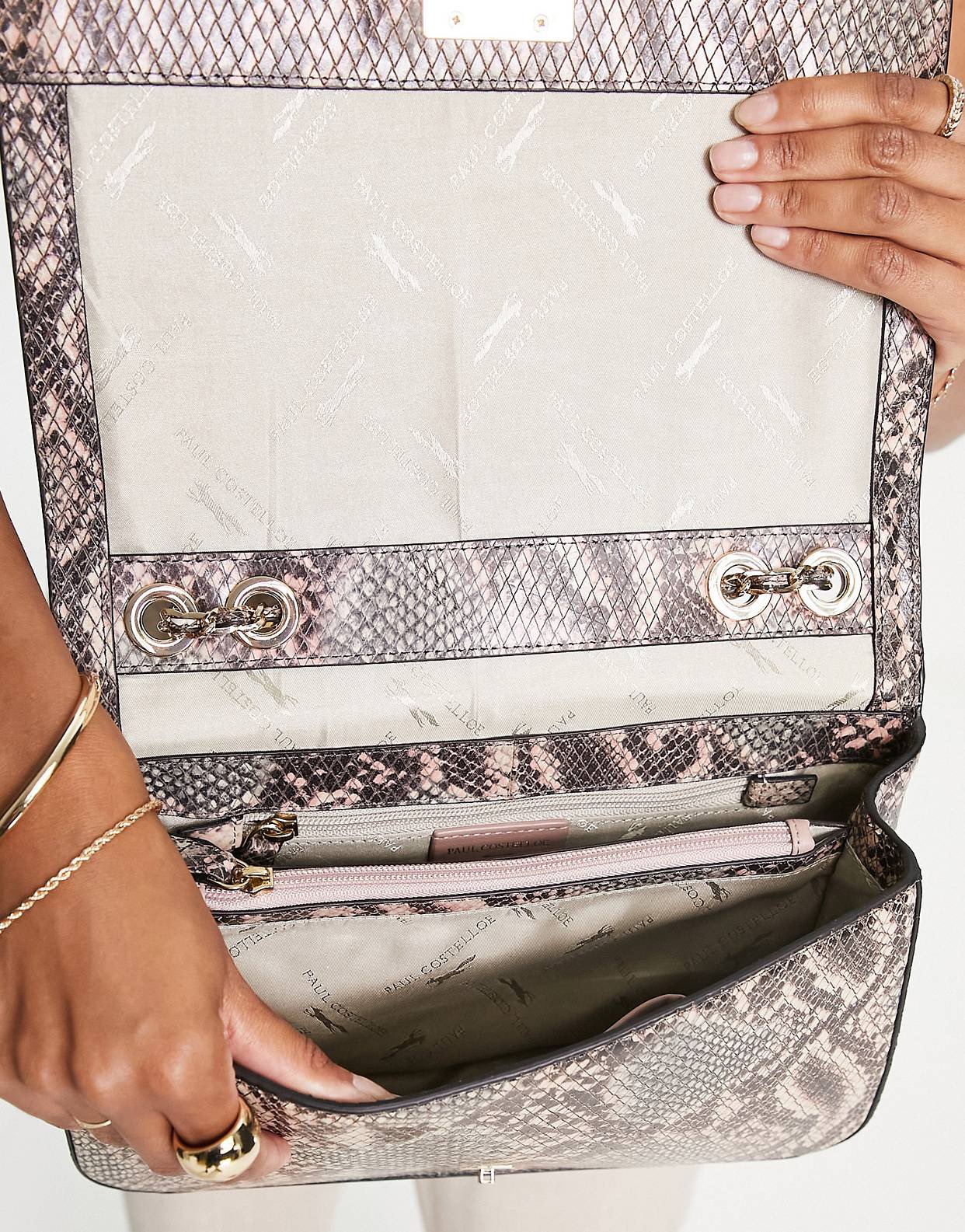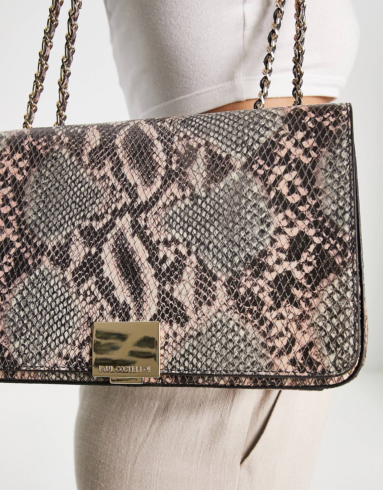 Paul Costelloe leather python print chain strap shoulder bag in brown