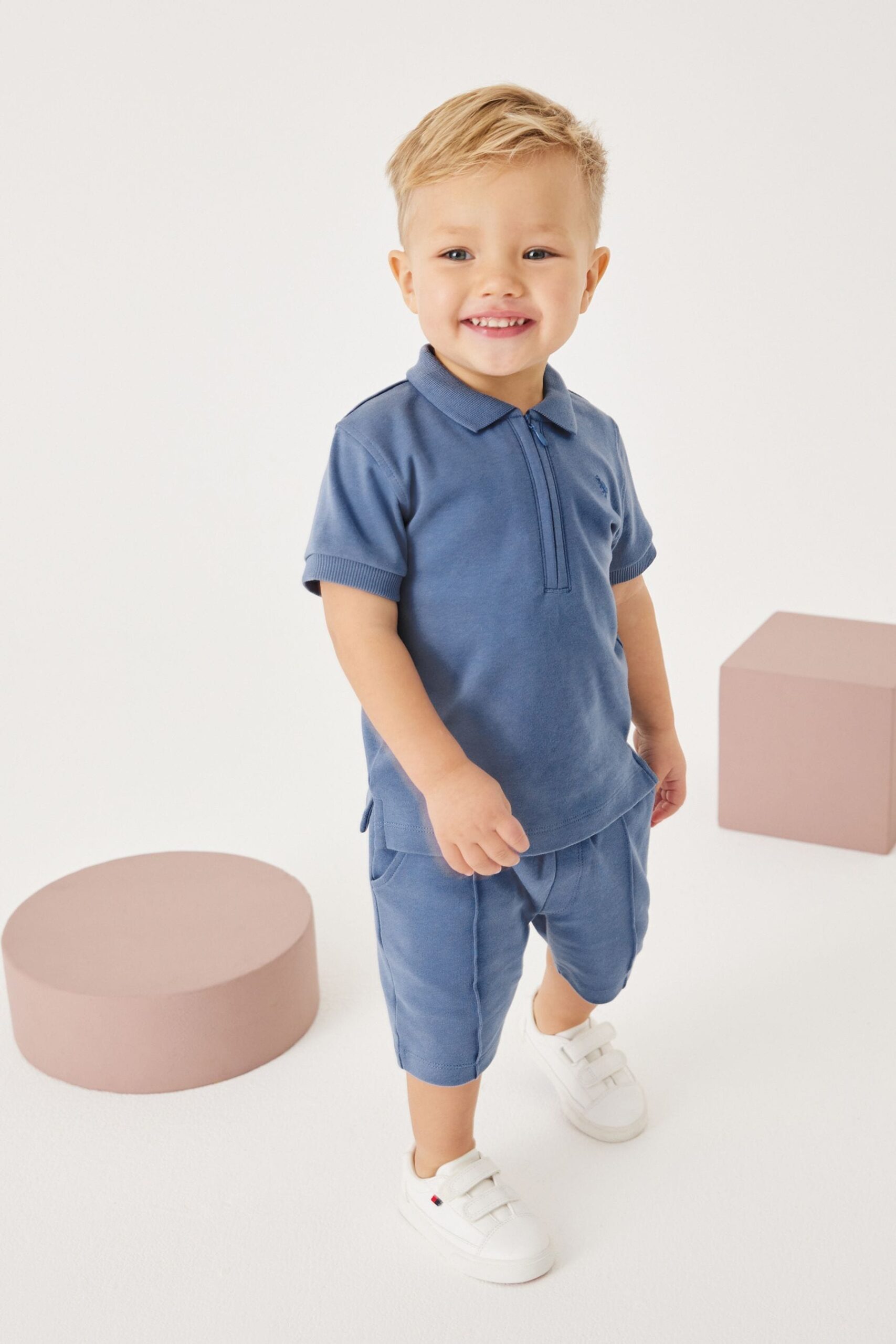 Dress up your little dude for the summer in this adorable outfit. Taking the hassle out of dressing, this matching two-piece set includes a short sleeve polo shirt with a concealed zip fastening at the neck that comes with a pair of shorts that are fitted with an elasticated waistband for the perfect fit. Made from soft cotton in a classic shade of blue, this gorgeous outfit will keep him stylish and comfortable throughout the day.